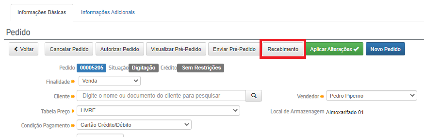 No pedido de venda com a condição de pagamento habilitada para pagamento com cartão, aparecerá o botão Recebimento, onde é possível informar o tipo de cartão Crédito ou Débito, quantidade de parcelas, rede controladora do cartão e o código de autorização.